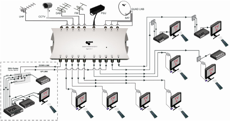 The DDU provides four inputs from a satellite dish quad LNB, which are fed through the unit to four satellite outputs with UHF signals from a terrestrial aerial, CCTV, DAB aerial and FM aerial added in. The separation of these signals is achieved at the wall plate (by filters), giving separate satellite and terrestrial signals:
