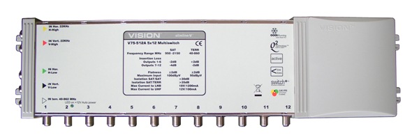 The multiswich has five inputs on the left-hand side, four from a satellite dish LNB and one terrestrial input (which can be a combined UHF, DAB and FM) signal.